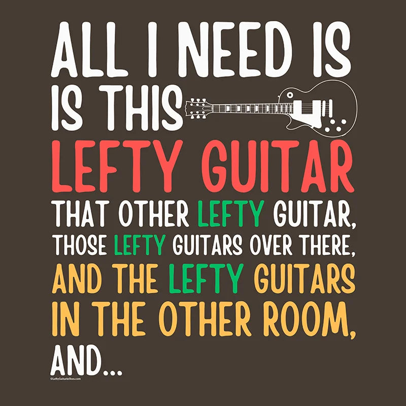 Featuring fun, vibrant text alongside a cool left-handed guitar graphic, this shirt is perfect for those who know the struggle (and joy) of always needing just one more lefty guitar.