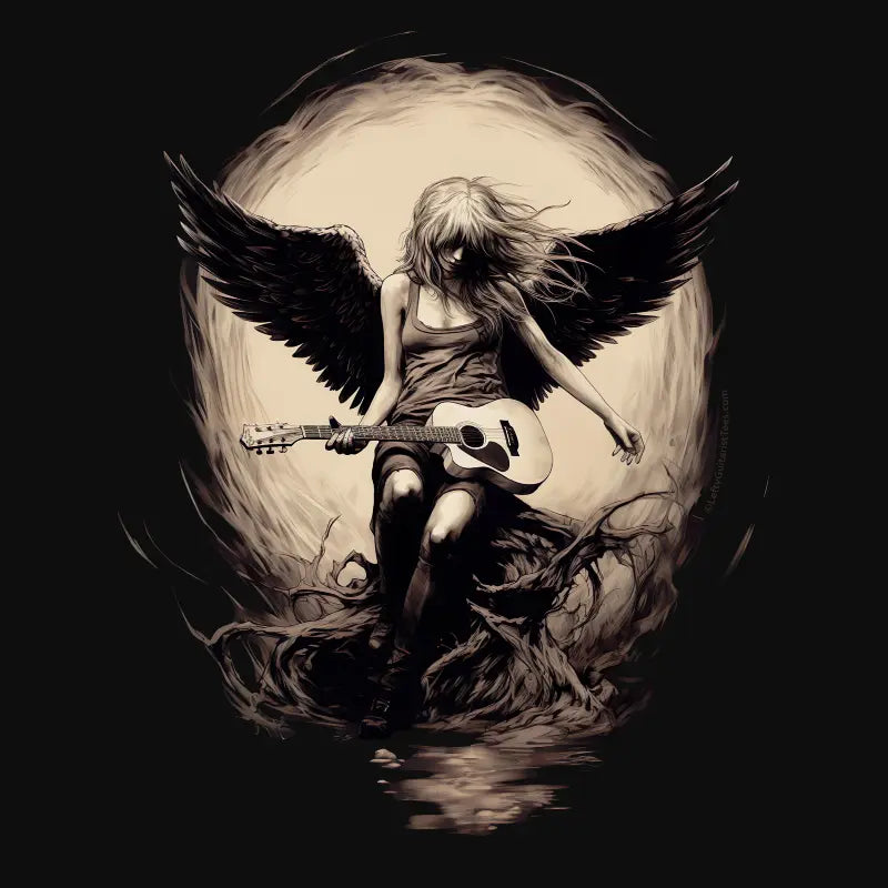 - Divine Design: This melancholy angel playing a lefty acoustic guitar isn't just a print; it's a statement.