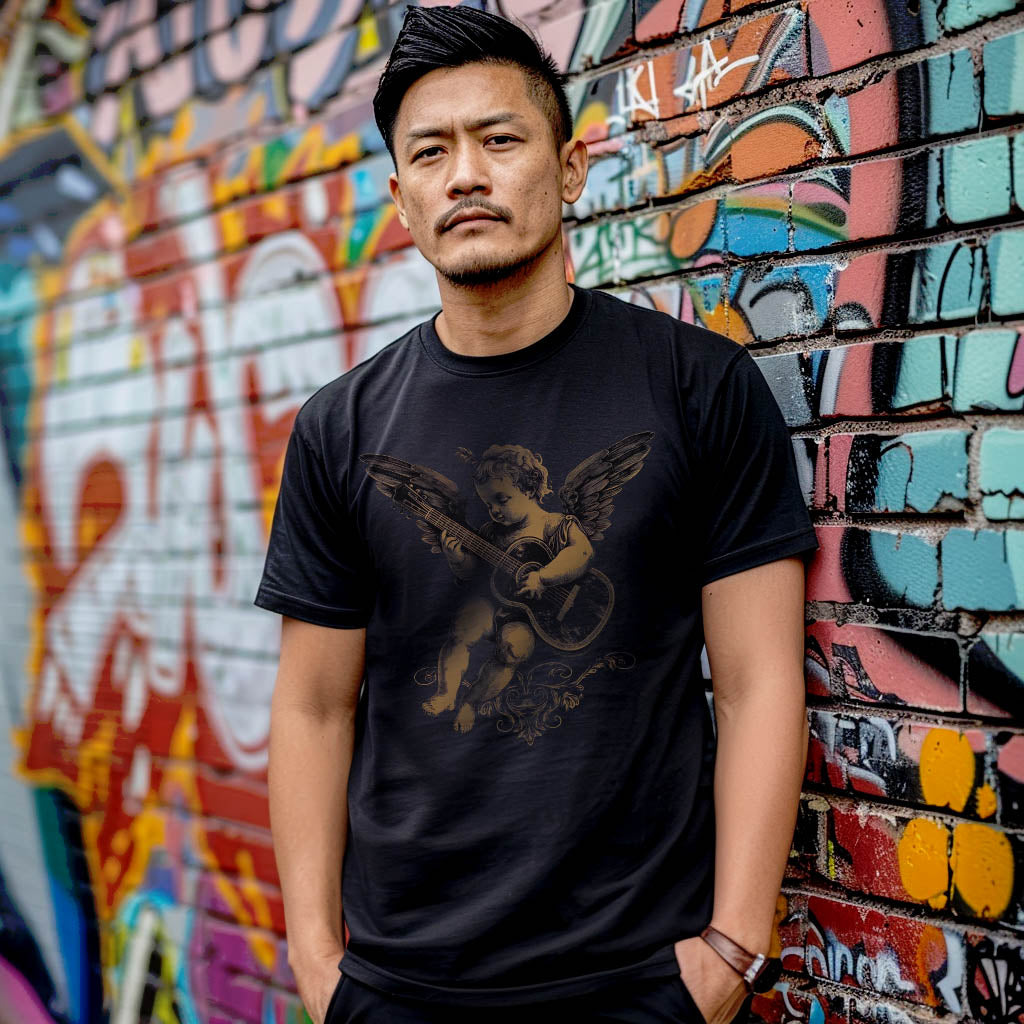Feel Cupid's harmonious blend of love and music on the front of this tee, with a subtle LeftyGuitarist logo printed on the back, ensuring you're repping your uniqueness without overpowering the main design.