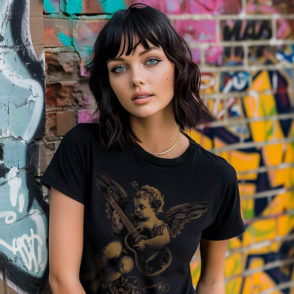 Fall in love with the "Cupid's Melody" LeftyGuitarist Tee, featuring a beautifully intricate design of Cupid plucking a left-handed classical guitar. This unique graphic blends the charm of love with musical artistry, making it a must-have for the left-handed romantic musician.
