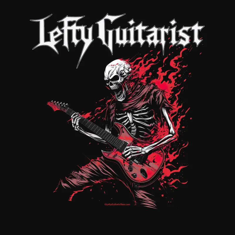 Embrace the heat of metal music with the LeftyGuitarist "Flaming Red Skeleton" Tee. Order now and let the world feel the intensity of your left-handed prowess!