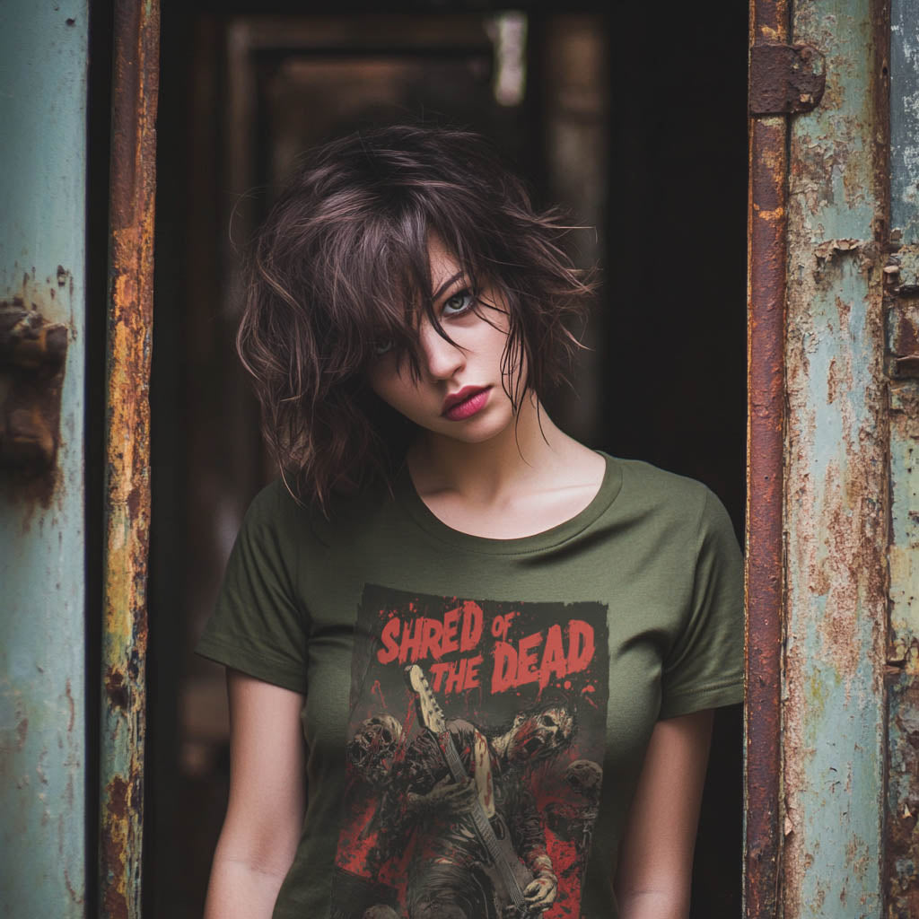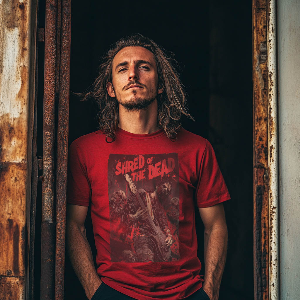 - One-of-a-Kind Design: The zombie guitarist and "Shred of the Dead" text make this tee a standout for horror and metal fans.