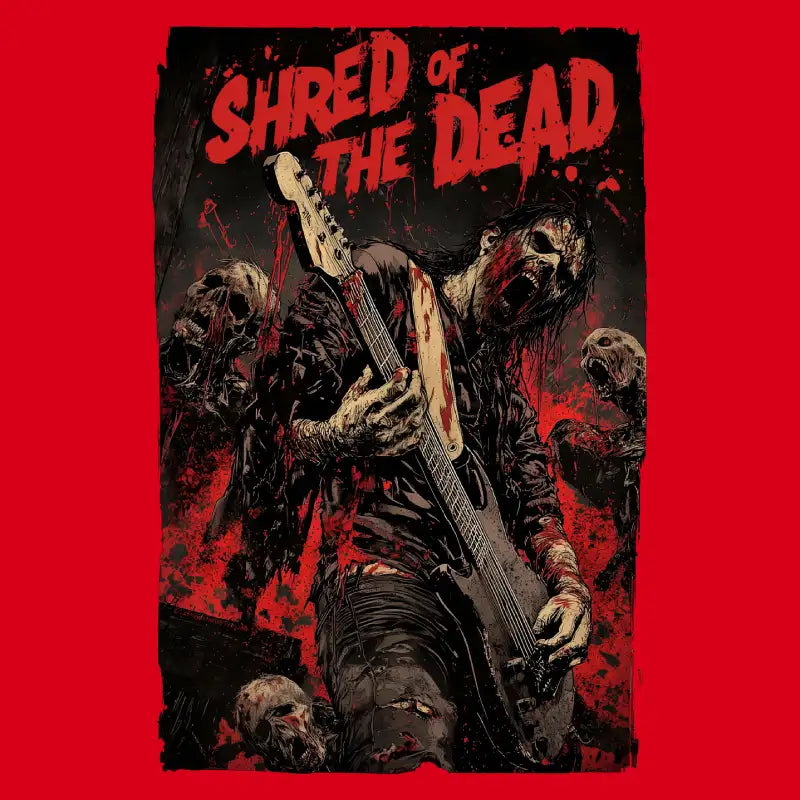 The bold red "Shred of the Dead" text at the top makes a powerful statement, perfect for metalheads and horror fans alike.